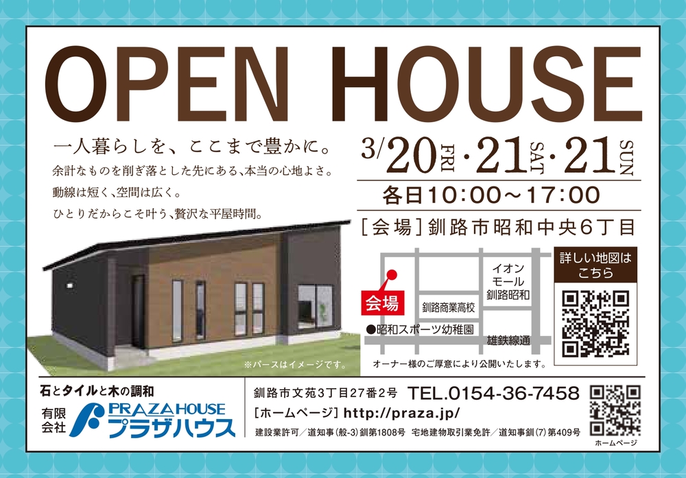 オーナー様のご厚意によりオープンハウスを開催することとなりましたので、ご案内いたします。「 ひとりだからこそ叶う、贅沢な平屋時間 」開催日3月20日~3月22日 3日間となります。時間10:00~17:00場所釧路市昭和中央6丁目24番16号ぜひお気軽にお越しください😊