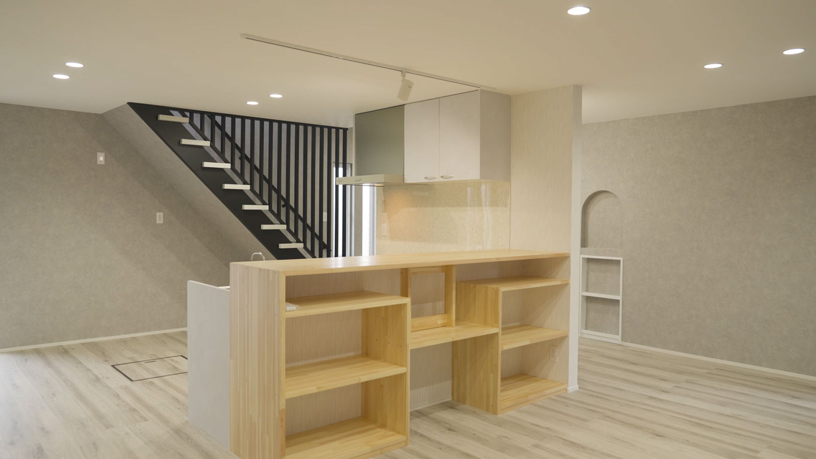 リビングダイニングには造作収納を設け、従来のカウンターではなく、使い勝手や用途に合わせてオリジナルで設計した収納を設置。