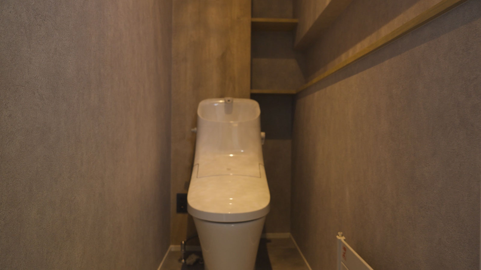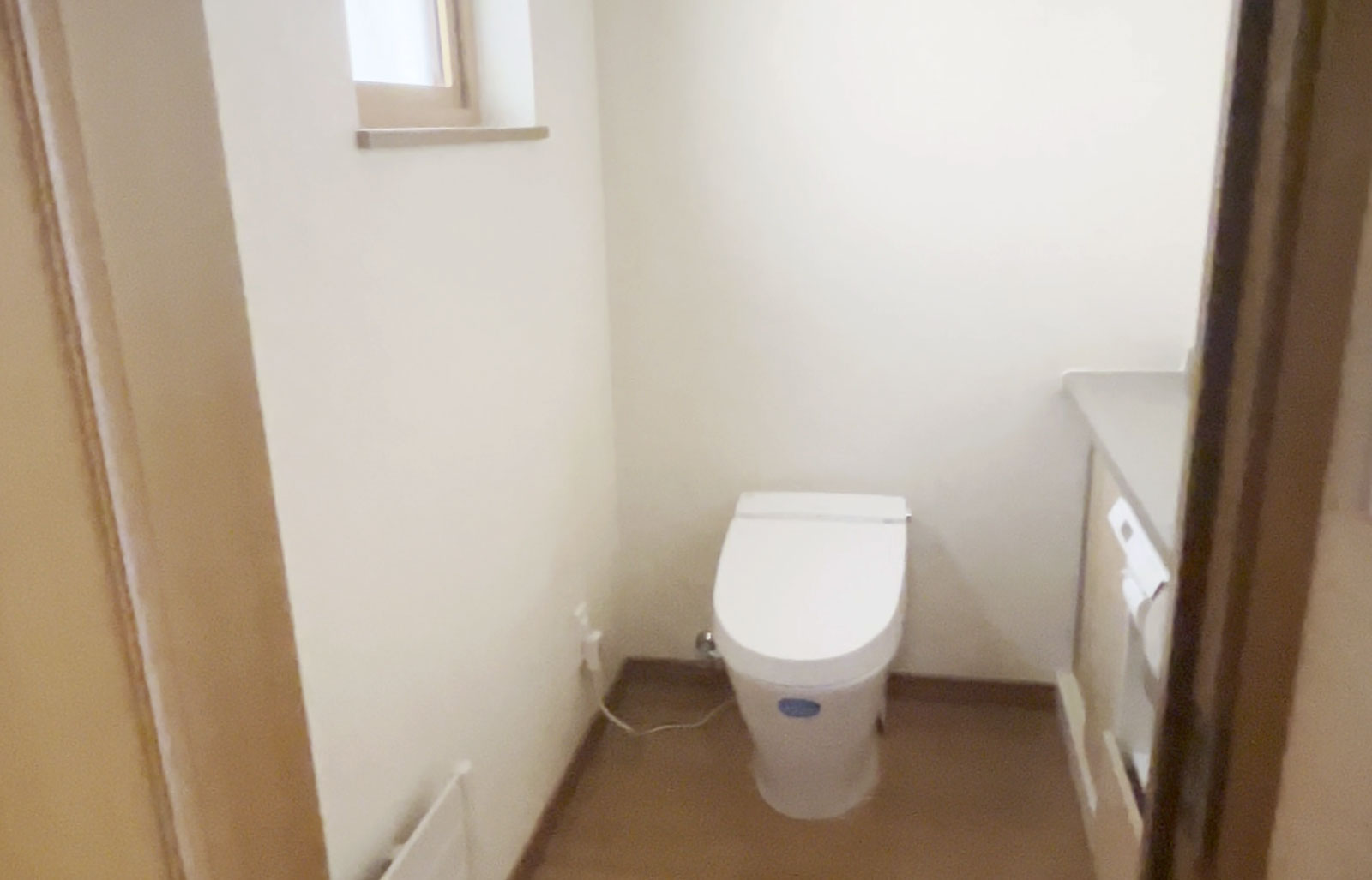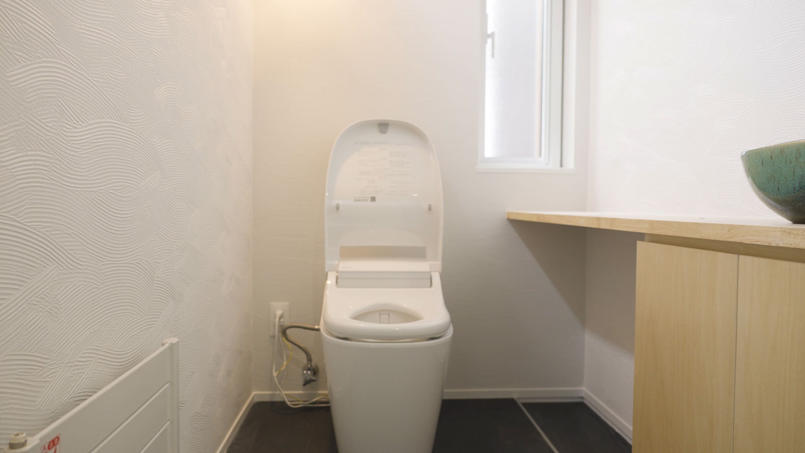 トイレにはカウンターや棚を造作で設け、収納と使い勝手を両立させた機能的な空間に仕上げました。