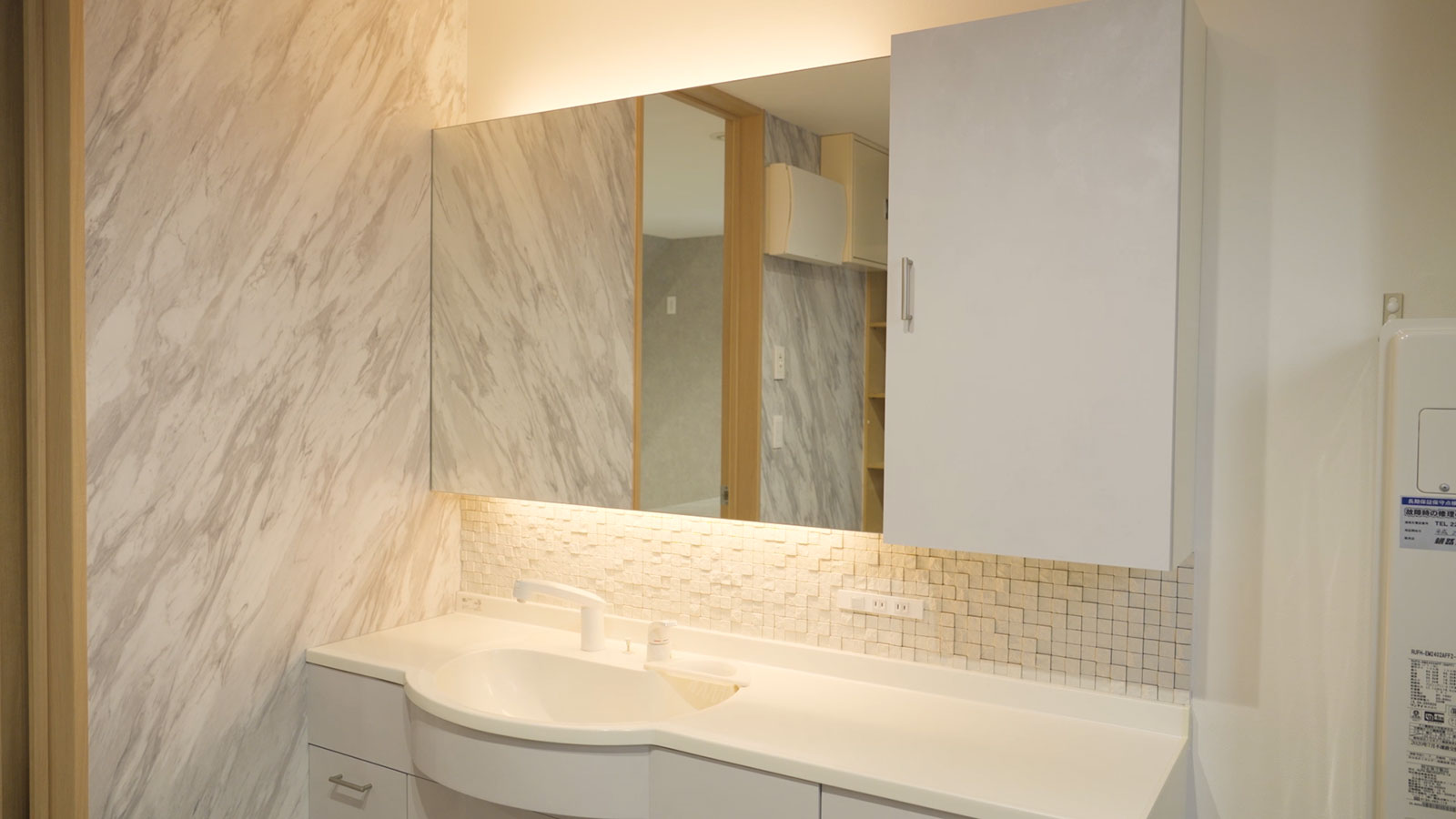 洗面台には鏡の裏に照明を仕込み、ホテルライク仕様に。鏡と洗面器の間にはタイルをあしらい、上質感と清潔感をプラスしました。収納扉にはリアテックシートを採用し、デザイン性と実用性を両立しています。