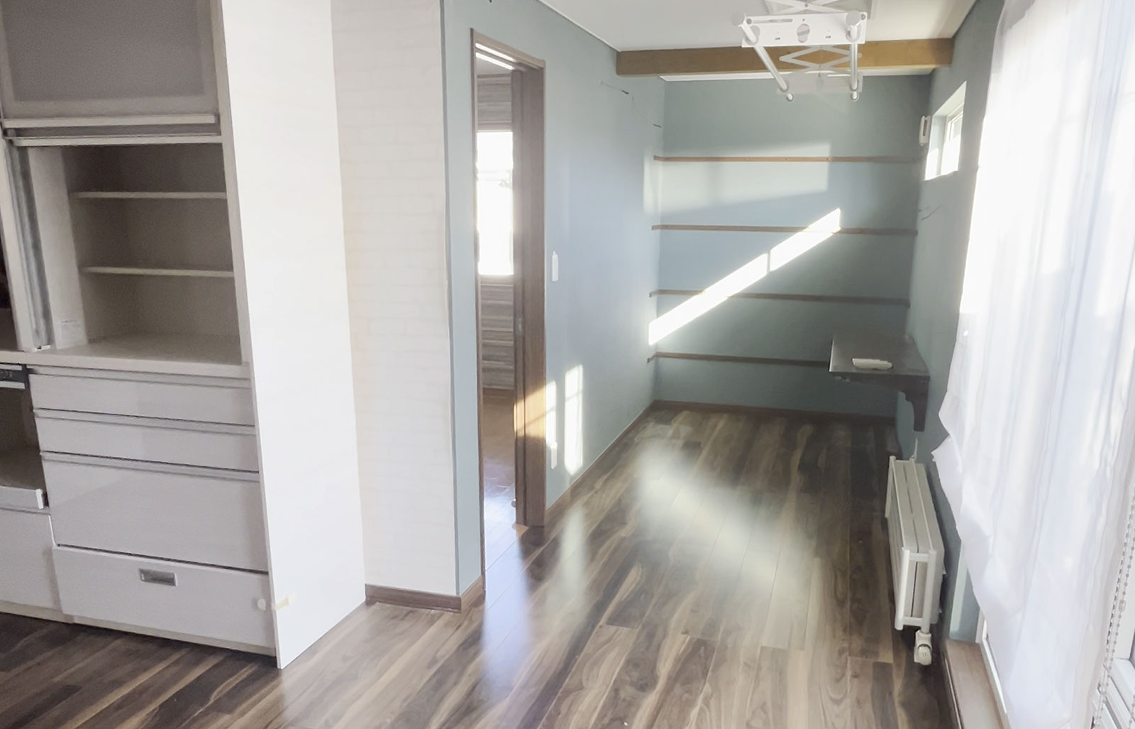 この部屋は、もともとあったウォークインクローゼットを撤去し、空間を最大限に拡張。広々とした間取りに生まれ変わり、飼っているペットにとっても過ごしやすい快適な空間となりました。