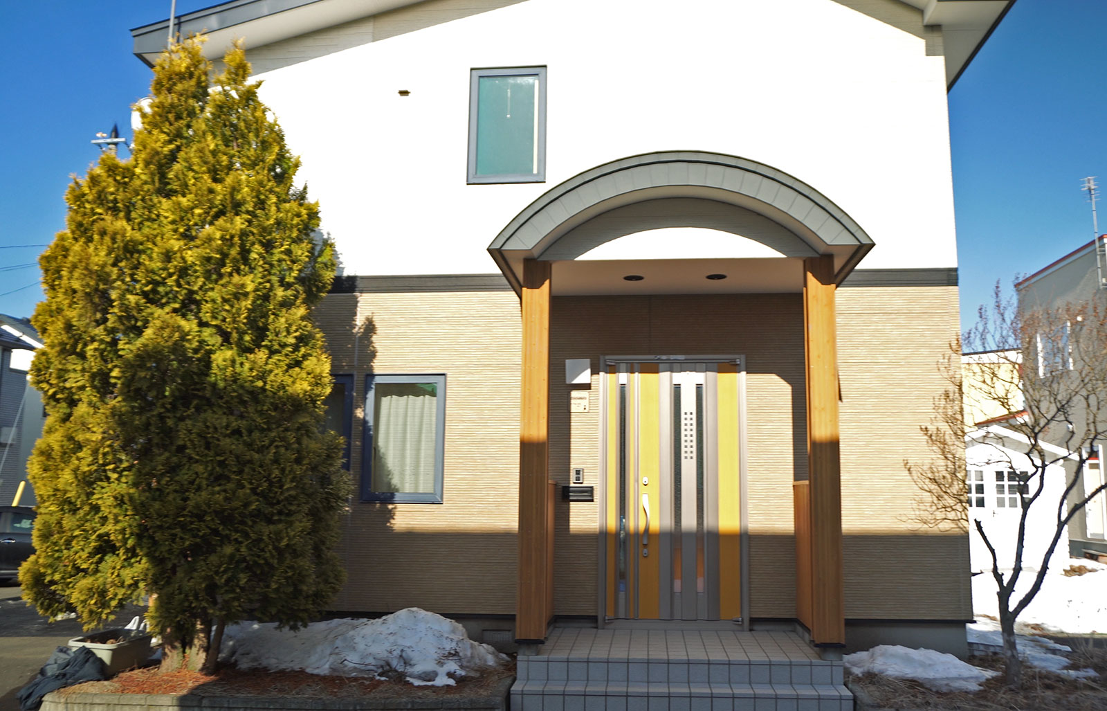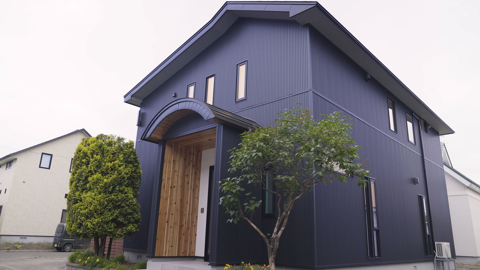 外壁には耐久性とデザイン性に優れたガルバリウムを採用し、玄関にはあたたかみのあるレッドシダーを、さらに照明まわりには漆喰を用いることで、素材の魅力が調和した外観に仕上げました。