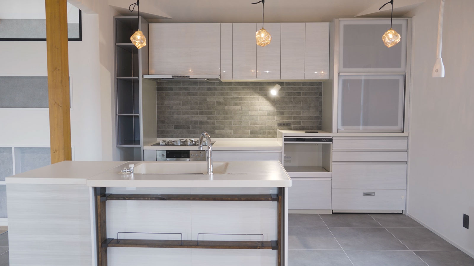 リビングダイニングには造作収納を設け、従来のカウンターではなく、使い勝手や用途に合わせてオリジナルで設計した収納を設置。